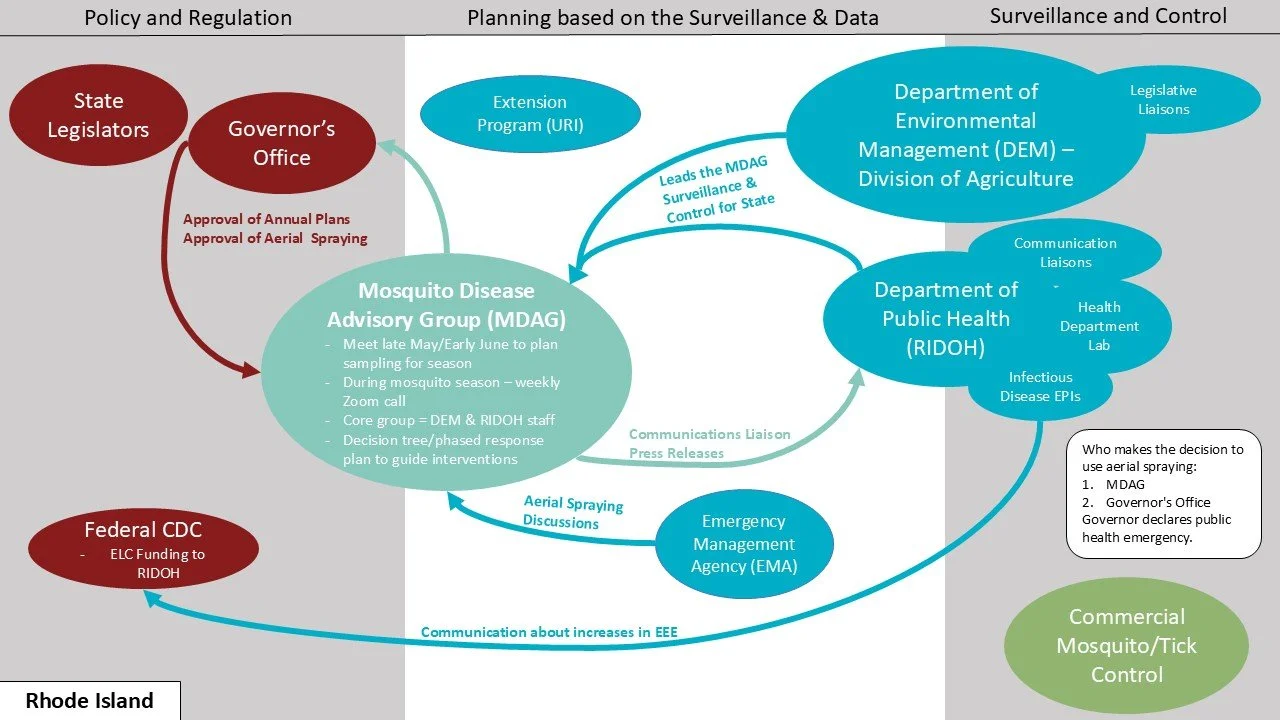 In Rhode Island, the state’s response to vector control is largely centralized, as there are no local health departments or mosquito boards, so all efforts are coordinated at the state level, primarily between RIDOH and RIDEM. Data-driven decision-making and regular, well-coordinated communication are notable strengths, helping maintain strategic response and outreach even with few staff and limited resources. The burden of vector-borne diseases like Lyme continues to grow, and prevention relies on public education campaigns, creative communication, and federal grants. Funding gaps leave staff with little capacity for expanding services, making community partnerships essential for prevention messaging and driving incremental policy change.